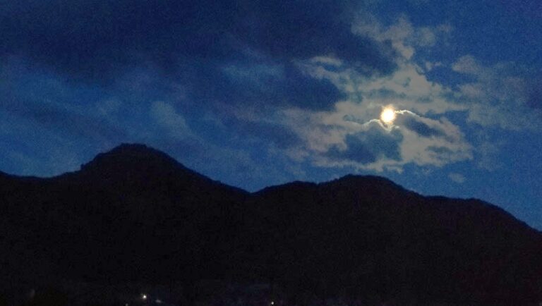 茜色の空をゆく中秋名月 天文アプリ予測の軌道上に