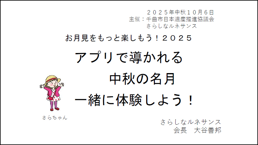 姪石苑での観月の前には、千曲市日本遺産センターで天文アプリの「ステラナビゲーター12」の画面をパソコンからスクリーンに映し出し、どのように操作すれば、事前に中秋の名月の現れる山の峯と時刻が分かるかを解説しました。このアプリを使うと、過去未來、世界のどこの場所でも中秋の名月の現われる様子を映し出すことができます。松尾芭蕉が「更科紀行」の旅で見た月の出、さらに北極で見られる中秋の名月もご覧いただきました。現代の「月の都」さらしな姨捨で最も有名な「鏡台山の凹んだ峯」から上がる中秋の名月は、どこでなら見られるのかについても、この天文アプリなどを使えば分かることをお伝えしました。(大谷善邦)