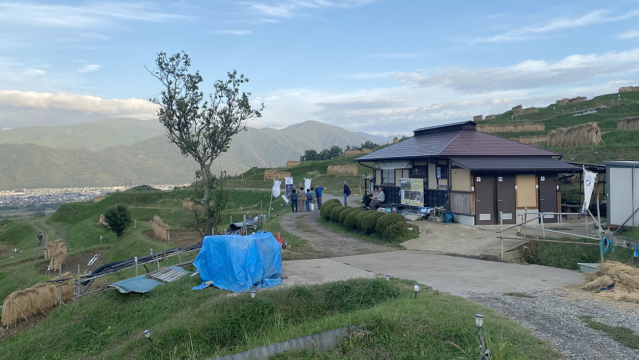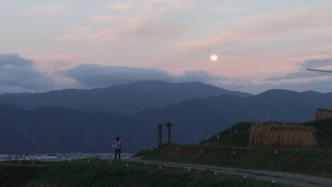 さらしなルネサンスは千曲市日本遺産推進協議会との共催で中秋10月6日、天文アプリが示すシミュレーション通りに中秋の名月が山の峯に現れるかどうか確かめるイベントを「姨捨の棚田」の一角にある姪石苑(めいしえん)で行いました。