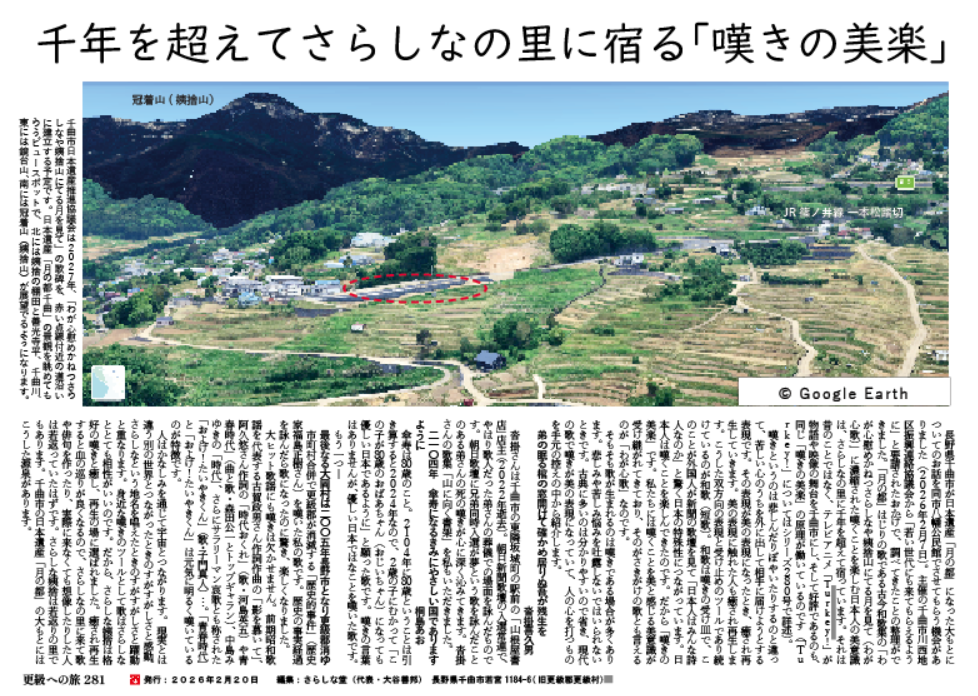 「月の都」はじりの歌である古今和歌集の「わが心慰めかねつさらしなや姨捨山にてる月を見て(わが心歌)」に濃縮された、嘆くことを楽しむ日本人の美意識は、さらしなの里に千年を超えて宿っています。それは昔のことではなく、テレビアニメ「Turkey!」が物語や映像の舞台を千曲市にし、そして好評であるのも、同じ「嘆きの美楽」の原理が働いています(「Turkey!」については本サイトの次をクリックhttps://sarashina-r.com/?p=10159)。
