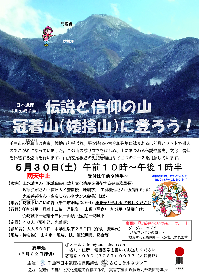 さらしなルネサンスは千曲市日本遺産推進協議会との共催で5月30日(土)、日本遺産「月の都」千曲市を代表する文化遺産である冠着山(かむりきやま)に登るウオーキングを行います(画像クリックでチラシ拡大)。 冠着山は古来、姨捨山(おばすてやま)とも呼ばれ、平安時代の古今和歌集に「わが心慰めかねつさらしなや姨捨山にてる月を見て」と詠まれて以来、都人をはじめ日本人が訪ねてみたいあこがれの山になってきました。この山がどのように出来たのかをはじめ、山にまつわる伝説や歴史文化、信仰を体感する登山です。