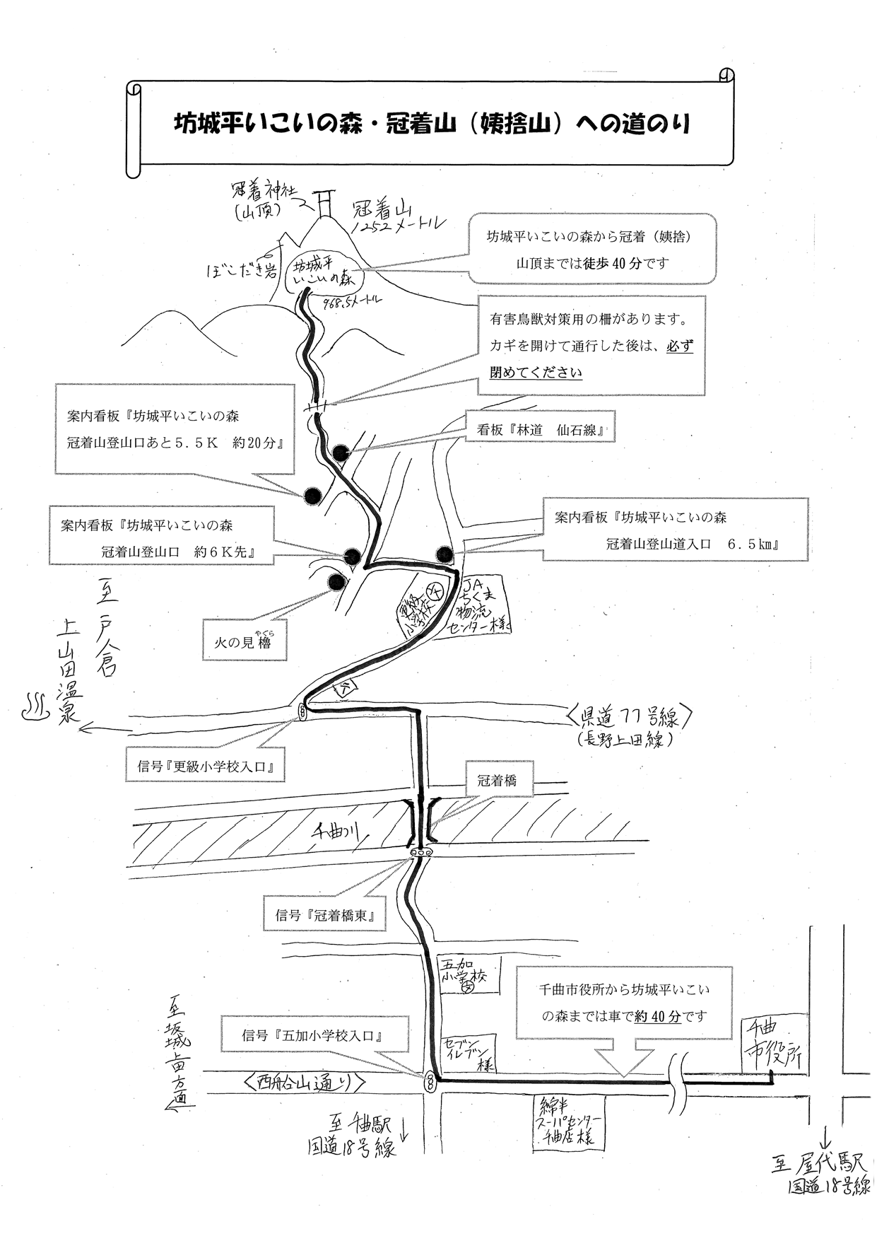 午前10時までに、冠着山の中腹にある「坊城平(ぼうじょうだいら)いこいの森」に車で集合してください。車は乗り合わせでお願いします。グーグルマップで「坊城平いこいの森」で検索すると、ルートが案内されます。参加者にはオリジナル「サラちゃん」缶バッジをプレゼントします。お子さんとのご一緒の参加もお待ちしています。集合場所までのルートの地図をチラシの裏面に掲載しています。