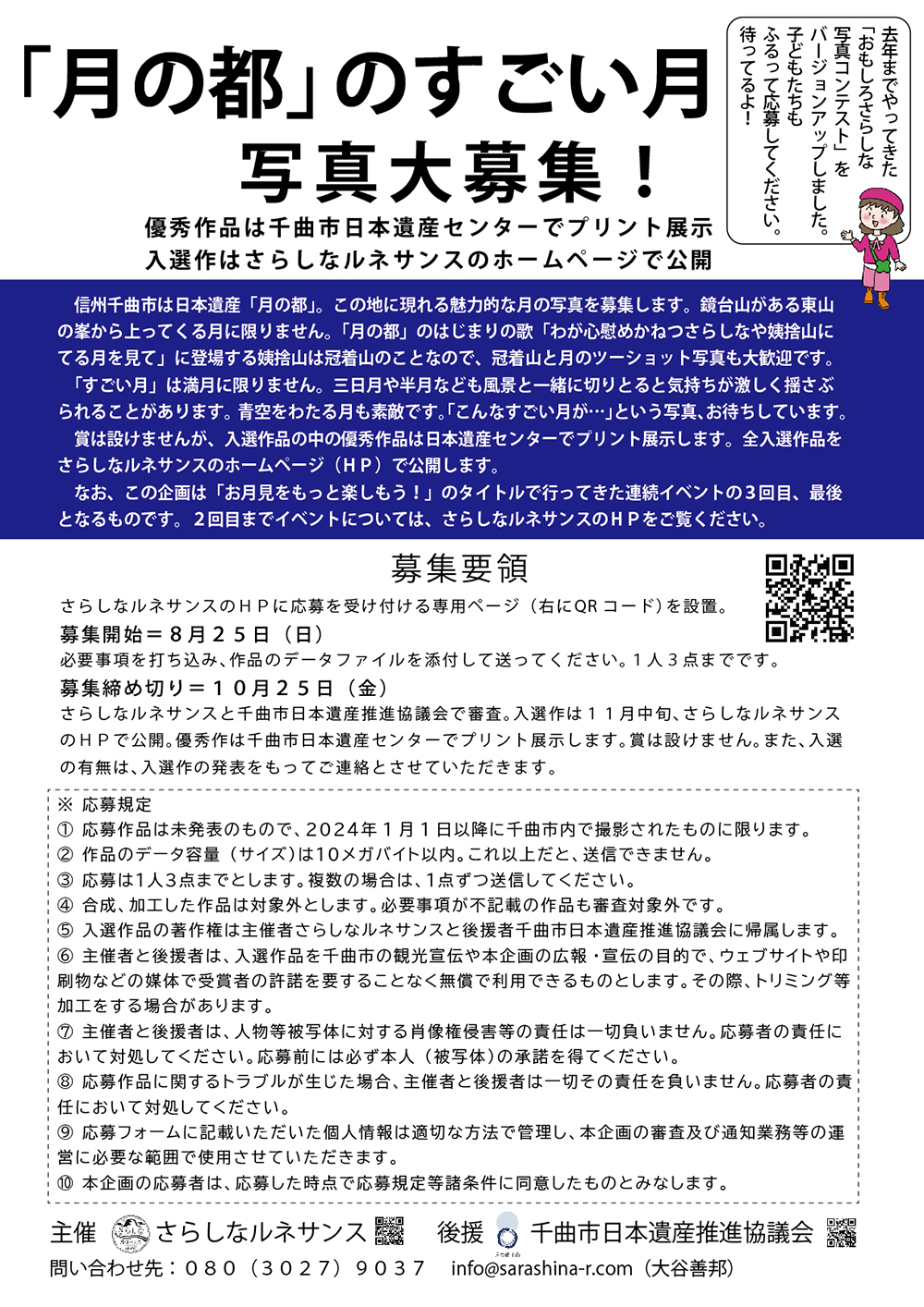 さらしなルネサンスが2024年度行っている「お月見をもっと楽しもう」連続イベント(千曲市日本遺産推進協議会後援)。最後の3回目として「月の都」千曲市で見ることができる「すごい月」の写真募集を開始しました。本会HPに、募集要領と応募規定を記載した応募フォームを開設しましたので、必要事項を打ち込み、写真のファイルを添付して送信してください。応募の締め切りは10月25日(金)。作品は今年撮影したものであれば大丈夫です。
