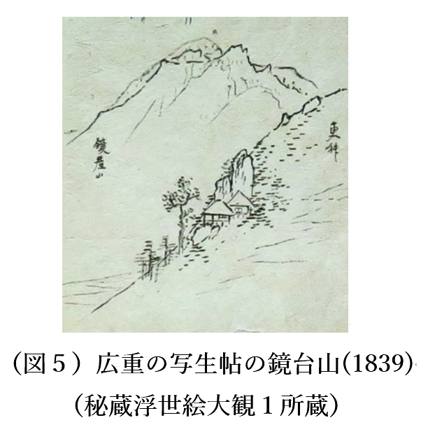 彼のスケッチを見ると「冠着山」の本来の位置に「鏡臺山」と添え書きされた山が描かれている(図5)。彼は「冠着山」と「鏡台山」を取り違えたのであろうか? 私たちはそうは思わない。なぜかというと、当然案内人もいただろうし、すでに述べたようにこの位置にある山が「冠着山(カムリキ山)」であることを知っていた筈だからだ。スケッチに目を凝らすと広重が添え書きした「鏡台山」は「ギザギザの山」と「丸っこい山」の二つが重なり合っているように見える。あたかも「ギザギザの山」が「丸っこい山」を隠しているようだ。
