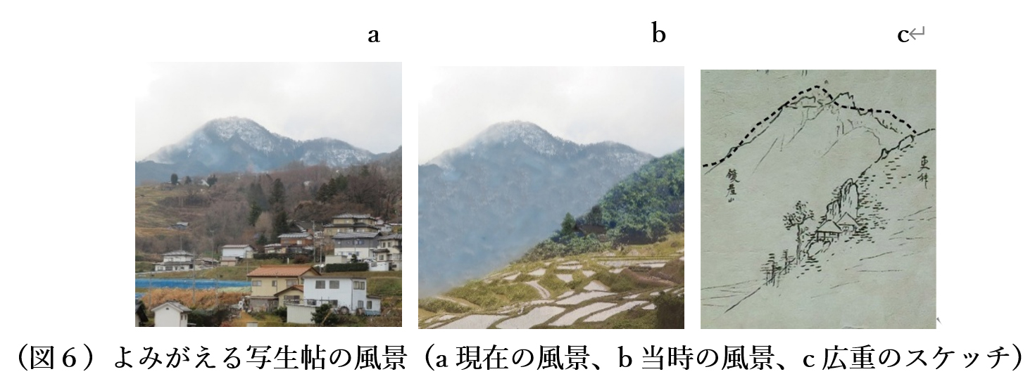 「冠着山」が隠されたのは彼が名所絵師としてどうしても月の名所「鏡台山」を描きたかったからだろう。彼は千曲川の東岸にあった「鏡台山」(図2⑥)を移動させて思い切って「冠着山」に重ねてしまった。彼がスケッチした場所から「冠着山」を眺めた時、気になった「姪石・曽根棚田のある尾根部」(図2➃)もスケッチの段階で消し去られたようだ。図6-aから中景の「姪石・曽根棚田」や人家を消し去ったのが図6-bで、これは広重のスケッチ(図6-c)そのものである。