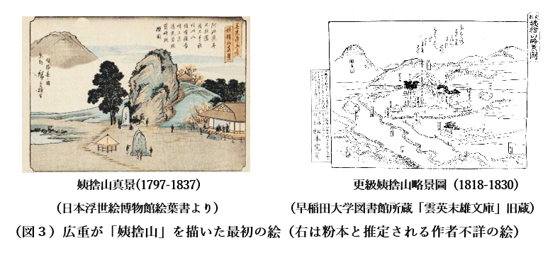 一つ目は「善光寺土産」と題する十枚揃えの版画のうちの「姨捨山真景」である(図3左)。この「土産シリーズ」の制作年代は日本浮世絵博物館によると寛政9年(1797)から安政5年(1858)の60年間ときわめて長く、その中で「姨捨山真景」の制作年を確定するのは難しい。