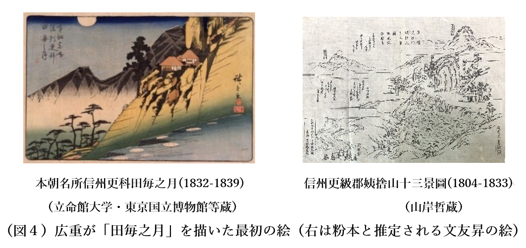 再び表1に基づいて粉本を探してみた。12枚の絵図の中で「水田に映る月」(田毎の月)が描かれていたのは2枚だけだった。表1の10番目、溪斎英泉の「信濃の国姨捨山田毎の月」は、広重が図4左を描いた1832年にはまだ世に出ていなかったから、粉本候補から外してもいいだろう。候補として残るのは表1の7番目「文友昇」の一枚摺「信濃更級郡姨捨山十三景圖」しかない(図4右)。同図には、「天保4年再版」と書かれているので、初版は1833年以前に発刊されたことは間違なく(千曲市の『名勝「姨捨(田毎の月)保存管理計画(改訂版)』では1804年頃と記されている)、広重が1832年にこれを模倣することは十分可能であったと考えられる。