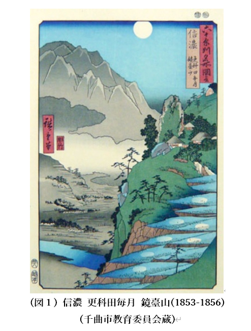 ここに一枚の浮世絵がある(図1)。歌川広重が描いたもので、版元「越平(越村屋平助)」の勧めで、嘉永6年(1853)から安政3年(1856)にかけて出版された浮世絵「大日本 六十餘州 名勝圖會」(以降「六十余州名所図会」)70枚のうちの一枚である。「彫竹」とあるのは、彫を担当した「横川竹二郎」のことだ。正確な制作年代は判然としないが、この4年間のうちであることは間違いない。 タイトルは「信濃 更科田毎月 鏡臺山」と刷り込まれている。