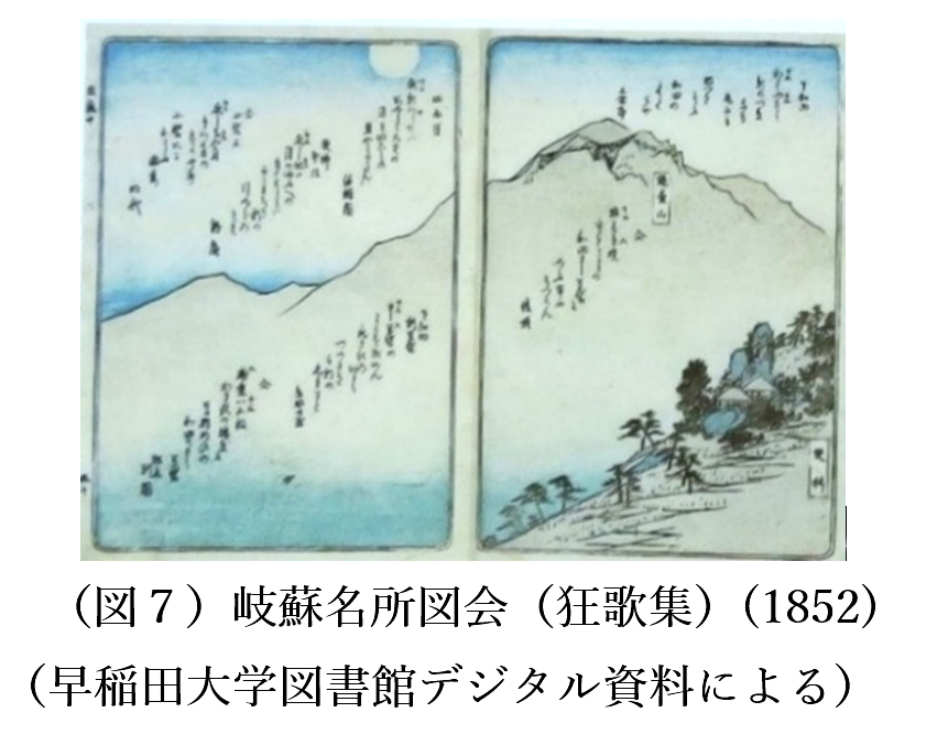 広重は、このスケッチを基に『岐蘇名所図会(狂歌集)』の挿絵を仕上げた(図7)。この絵はほぼスケッチの通りである。山には「鏡臺山」と添え書きされている。ただ集まった七つの狂歌を右ページのスケッチの構図に入れるには、スペースが狭すぎるので、最も簡単に鏡台山の山裾を左に伸ばし、もう一頁を設けたのであろう。山裾を延ばすだけでは侘しいのでこの頁には月を入れたのだろう。早稲田大学が所蔵する図絵の奥書によると発刊はおそらく1852年だった。