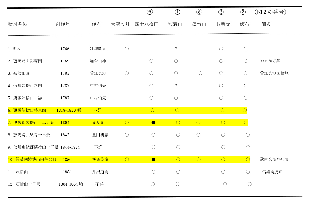 表1. 江戸時代の更級姨捨山絵図(広重関連は除く)(〇 有,● 棚田に月が映る,?山は有るが名前がない)