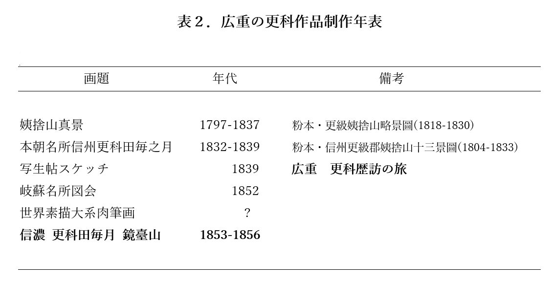 ところで、昭和49年(1974)に発刊された『浮世絵体系11. 』(集英社)の、「信濃 更科田毎月鏡臺山」(図1)の解説文で、後藤茂樹氏は「右側の山が姨捨山で左側が鏡台山、この山にかかる名月は諸人に喧伝された。(中略)姨捨山の中腹から下にかけて田圃ごとに丸い月影を宿している(後略)」とあり(下線筆者)、長楽寺のある山地を姨捨山と誤認されているようだ。「姨捨山の位置」は時代とともに移動したこともあるので(矢羽 1988)、この記述もあながち誤りとは言えないが、後藤氏の言う「この山」はこれまで述べてきたように間違いなく「冠着山(姨捨山)」である。これまで「広重の鏡台山は冠着山だ!」と大きな声が上がらなかったのは、専門家の多くが泰斗・後藤氏のこの解説文に影響され続けてきたからではあるまいか。稿を閉じるに当たって、これまで述べてきた広重の諸作品の制作年代の一覧を、繰り返しになるがまとめて示しておく(表2)。