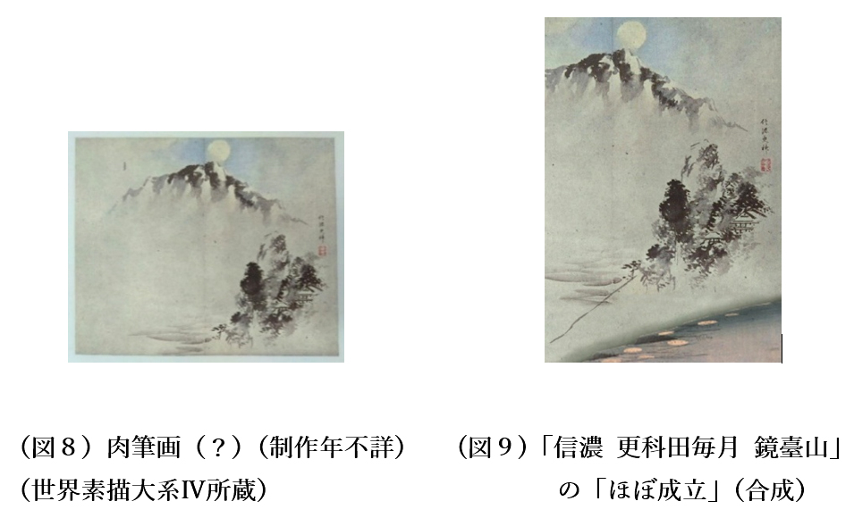 図8が掲載されている『世界素描大系』には制作年は書かれていないが、広重は自分の「本朝名所信州更科田毎之月」(図4左)から四十八枚田に映る「田毎の月」を草稿画(図8)に貼り付けると、これで「信濃 更科田毎月 鏡臺山」の「ほぼ成立」(図9)であり、後は「完成」(図1)を待つばかりである。目を凝らすと完成作品の図1にも隠された冠着山のなだらかな稜線が見て取れる。図1では広重が実際の風景を見ているので、図4左の長楽寺が崖の上にあるかのような不自然さは消えている。かくして表題の浮世絵は成立したわけだが、その成立には写生旅行以前の作品も大きな影響を及ぼしていたのである。