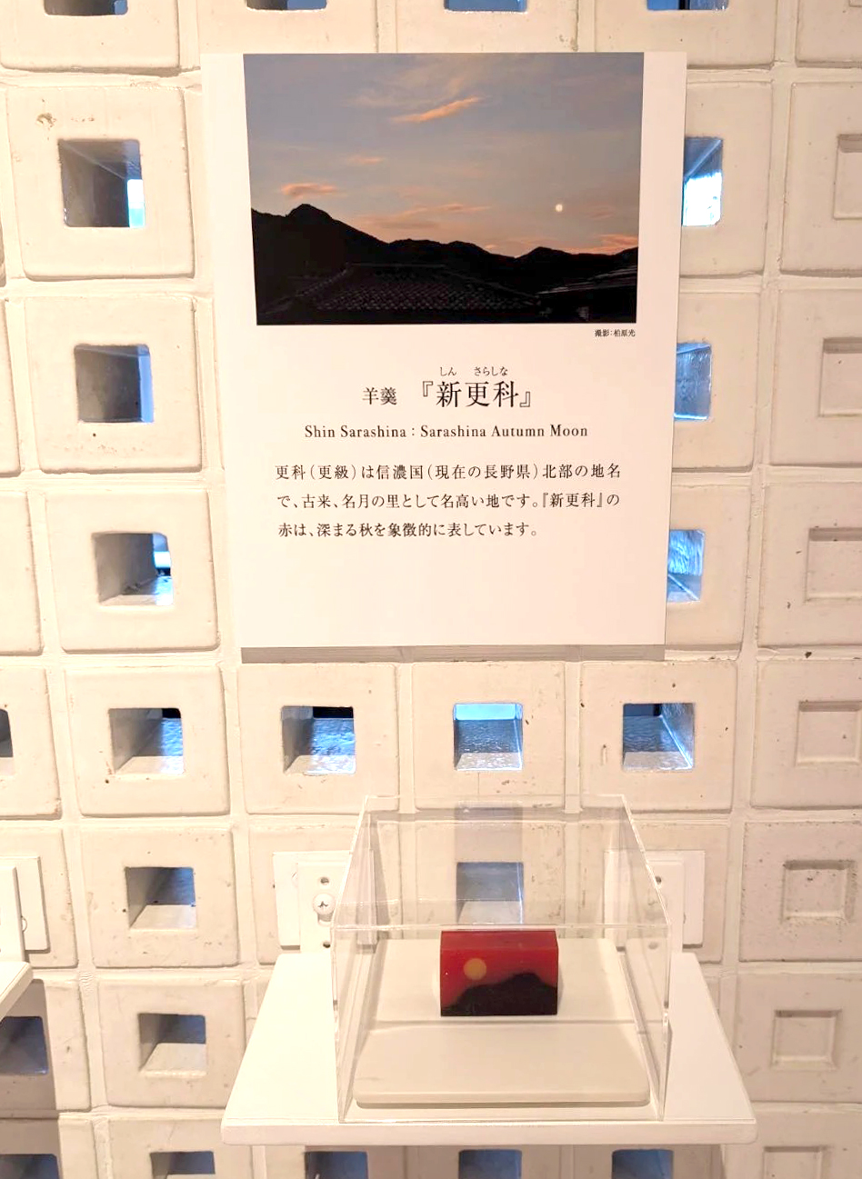 羊羹「新更科」 更科(更級)は信濃国(現在の長野県)北部の地名で、古来、名月の里として名高い地です。「新更科」の赤は、深まる秋を象徴的に表しています。