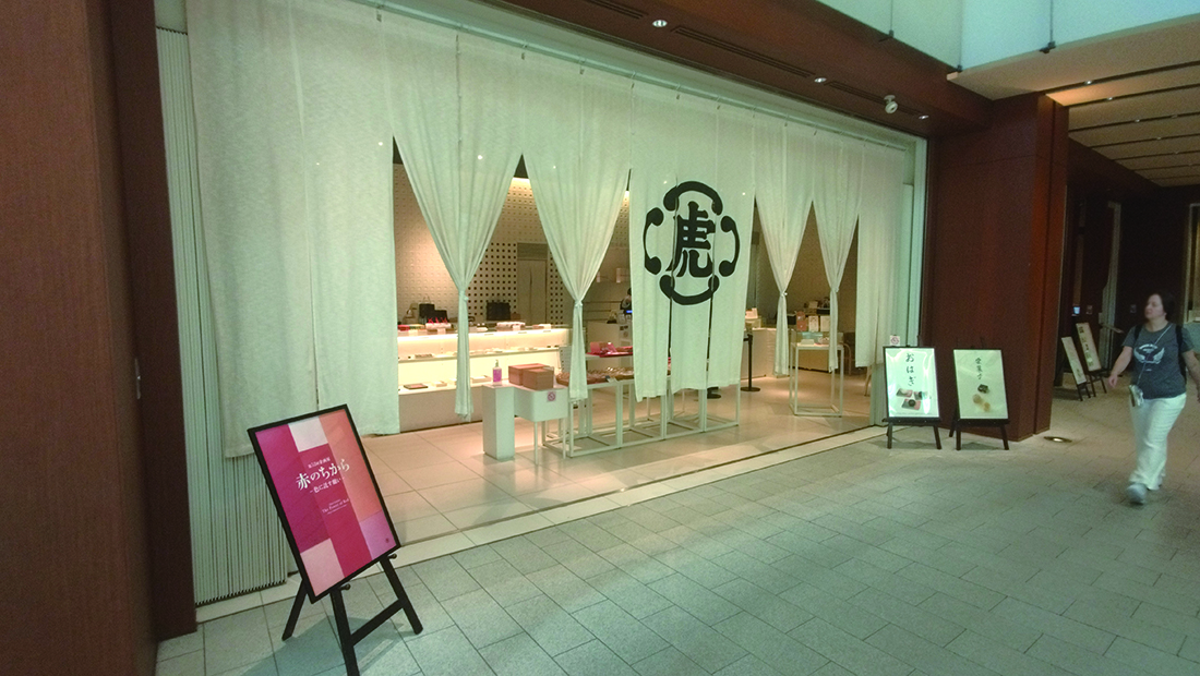 この展示は、日本の伝統文化をとらやの和菓子とからめて紹介する「赤のちから―色に托す願い」という企画展の一部。柏原さんの写真がとらえた朝方の冠着山(姨捨山)の黒いシルエットと朝焼けの様子が、展示ケースの中に入った羊羹の切り口のデザインと色に重なります。羊羹の赤色は、深まる秋を象徴的に表したものだそうです。この写真を見た人は羊羹の味がさらにおいしくなるだろうと想像しました。